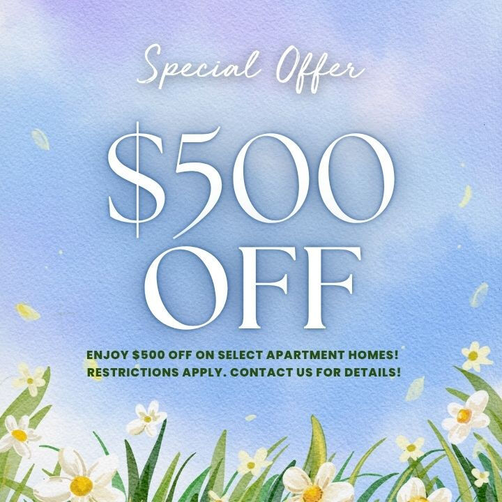 Enjoy a $500 Move In Discount on Select Apartment Homes! Restrictions Apply. Contact Us for Details!